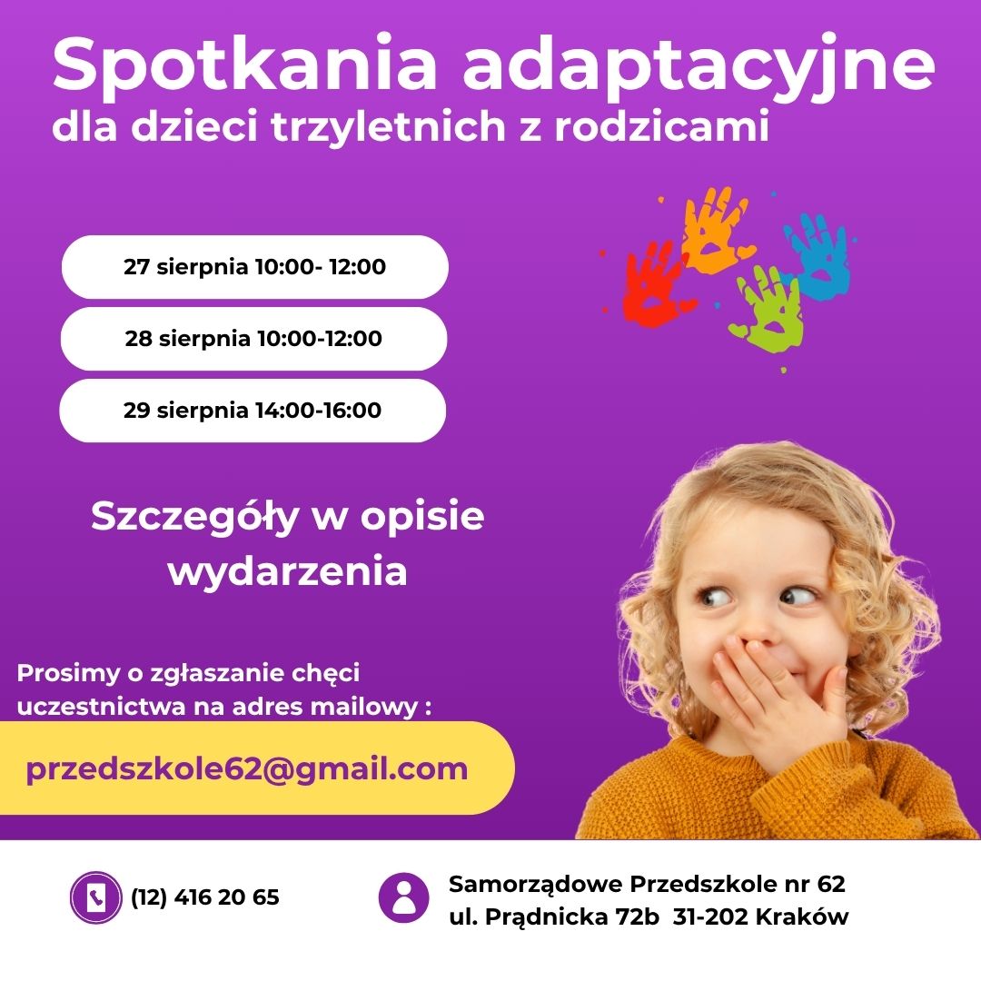 Zajęcia mają na celu zapoznanie dzieci z nowym otoczeniem i nauczycielami, a rodzicom dadzą możliwość obserwacji i wsparcia dziecka w tym procesie. W programie przewidziane są zabawy integracyjne, spacery po przedszkolu oraz aktywności dostosowane do wieku dzieci. Prosimy o zabranie ze sobą obuwia na zmianę oraz uśmiechu. Prosimy o potwierdzenie obecności na adres e-mail: przedszkole62@gmail.com do 13.08.2025 r. (środa).